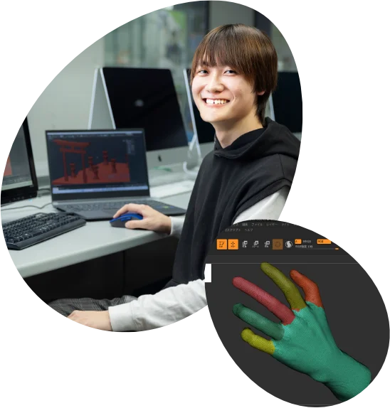 現役で活躍する3Dモーションデザイナーから直接指導を受け、キャラクターやモンスターなどに「動き」を与える技術を基礎から応用まで学びます。モーションとは迫力ある攻撃や自然な仕草、豊かな表情を動かすことでキャラクターに生命を吹き込み感情や個性を表現する重要な工程です。本専攻では3DCGを用いたアニメーション制作に特化し、ゲームやアニメ業界で求められる実践的なモーション制作スキルを習得。将来はモーションデザイナーや3Dアニメーターとして、映像やゲーム制作の最前線で活躍できる力を育成する専攻です。