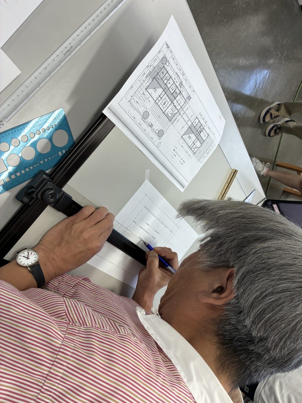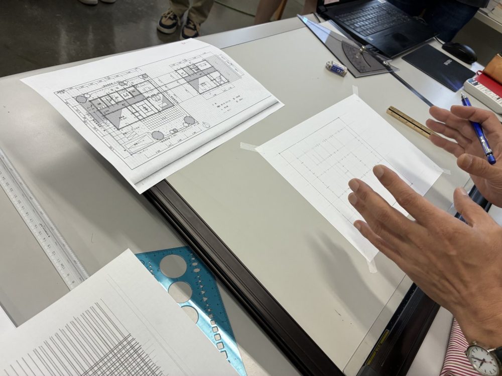 この日は平面図の手順を確認。「実際作図しているところを見てもらう方が伝わるかな、」ということで中村先生が実演。手順だけでなく線の濃淡さやスピード、心得などもコメントしながら学生に披露する姿は流石です。