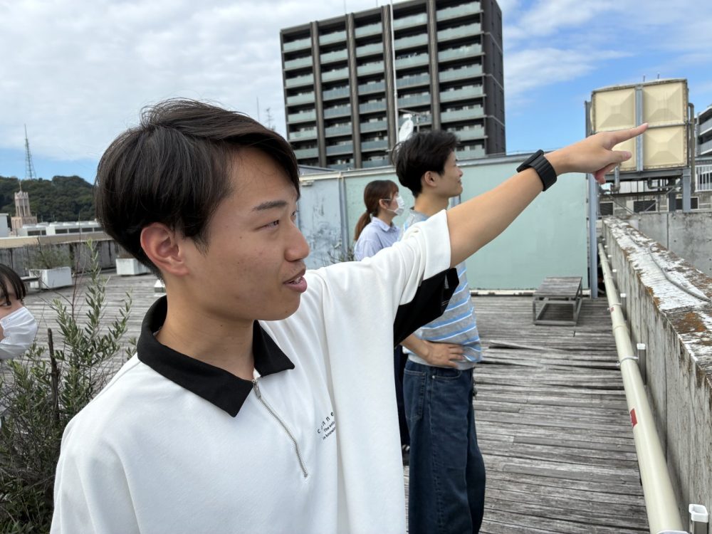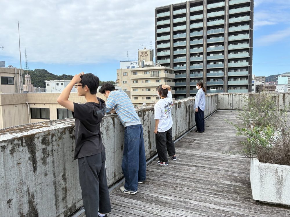 この日の課題は「パッシブデザイン」を見つけることでした。まずは屋上から眺めてみて「あの辺りがパッシブデザイン」など話し合いました。(パッシブデザインとは太陽の熱や光、風といった自然の力で快適な環境を実現する設計手法)