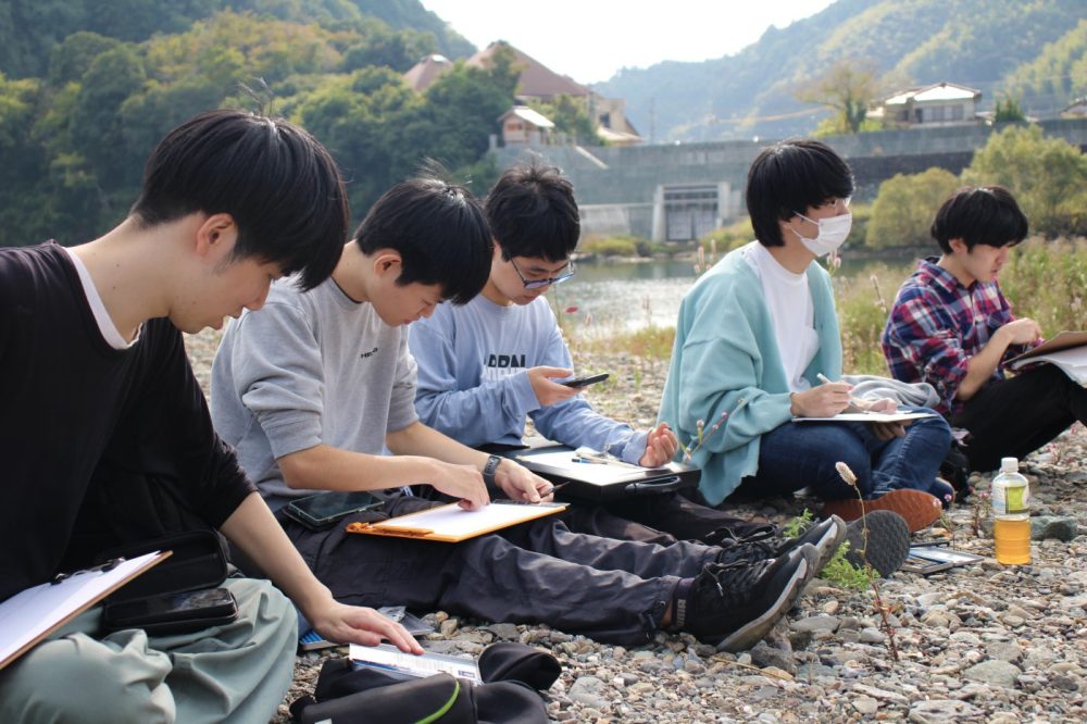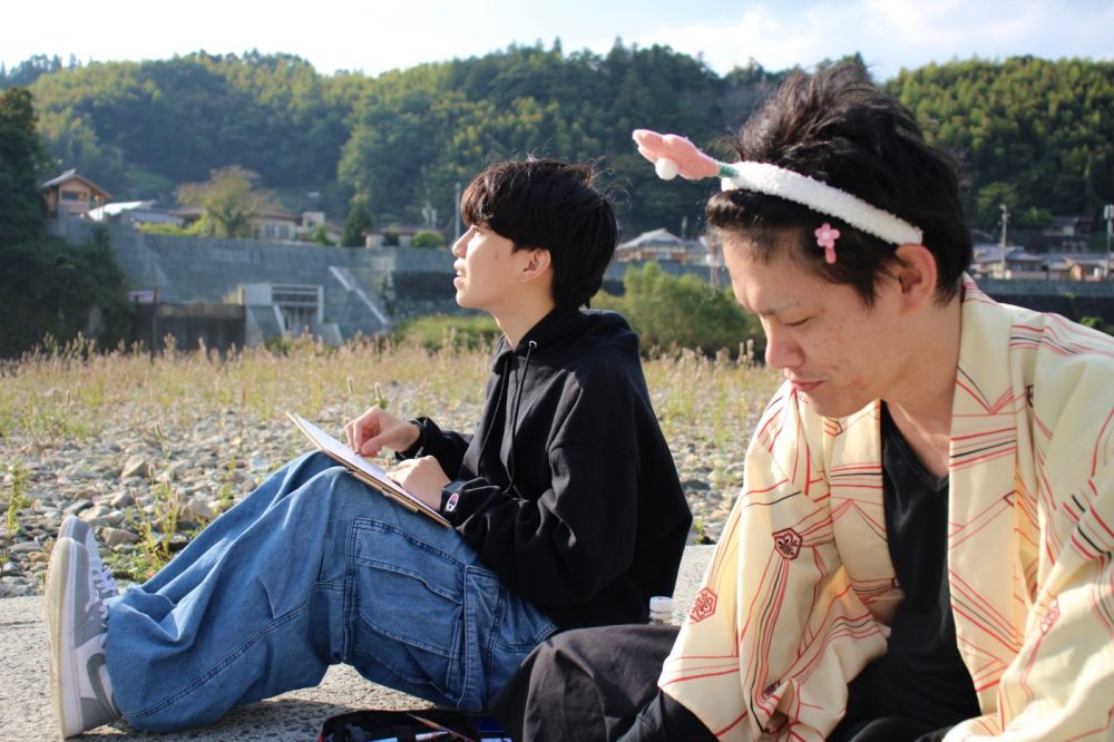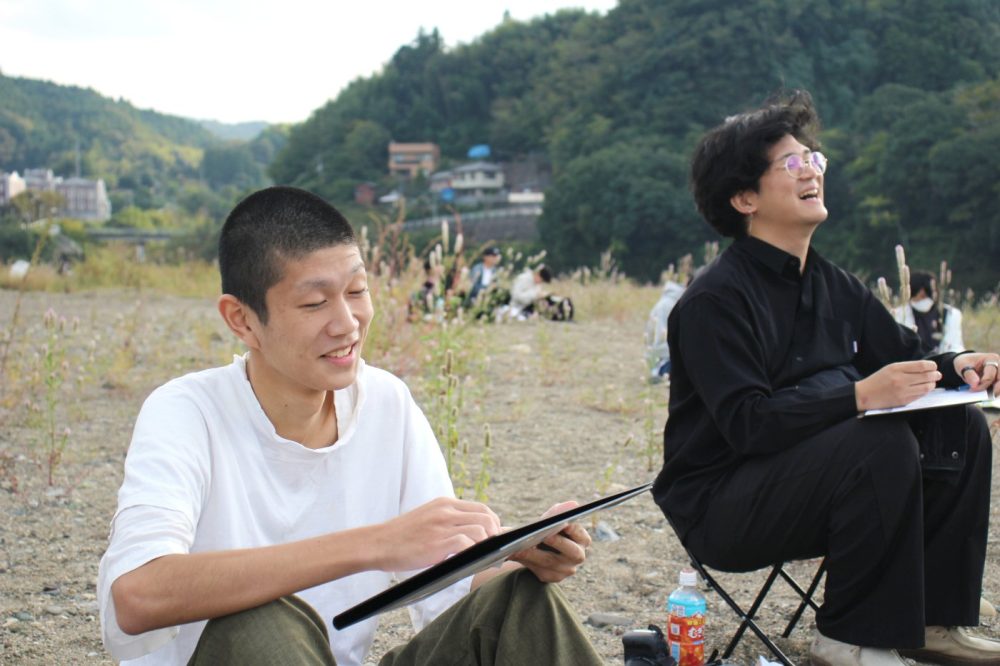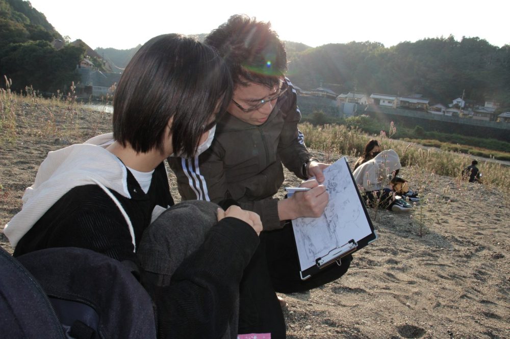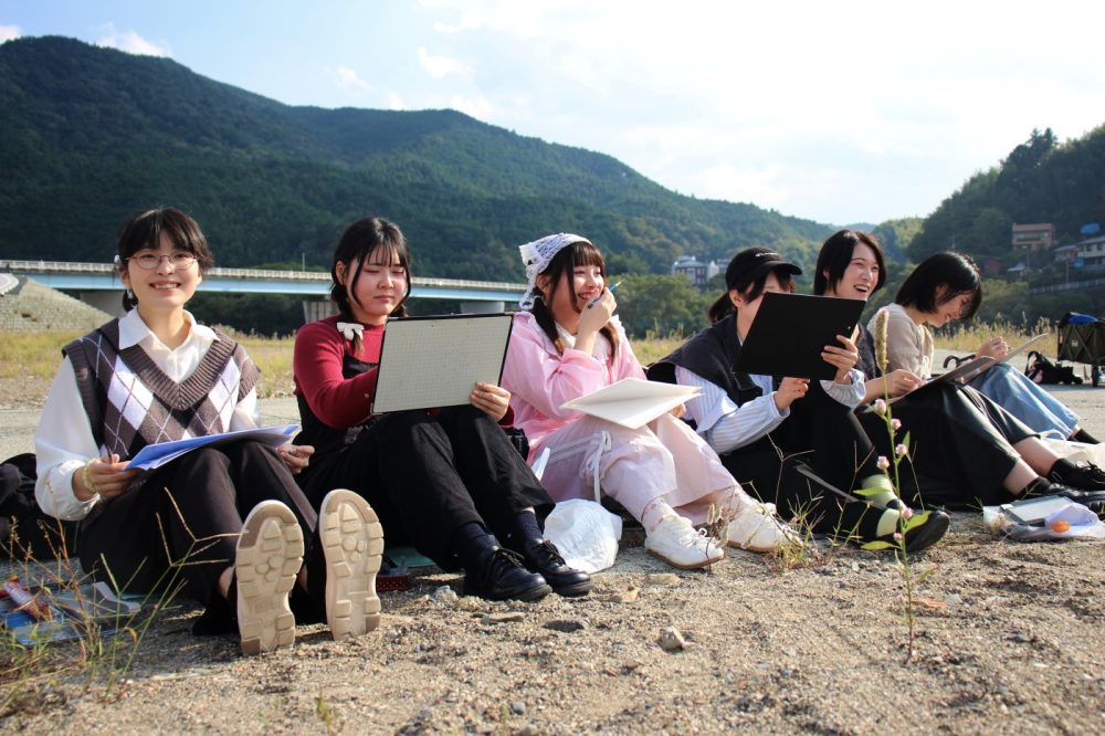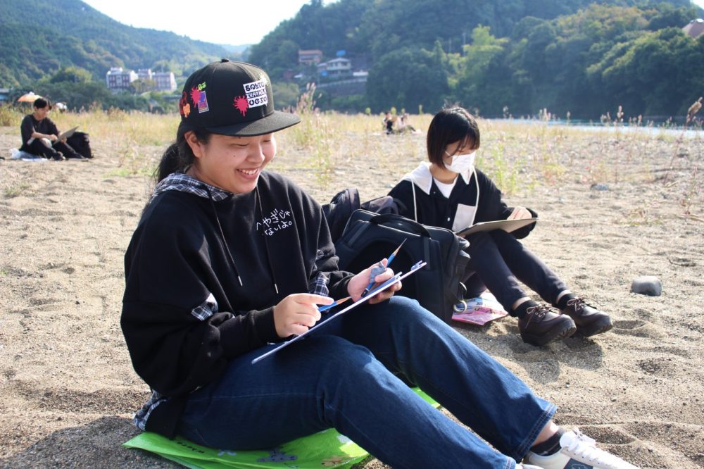 自由行動の後は、臥龍山荘の一角が見える肱川河で集合しデッサンの準備を行います。