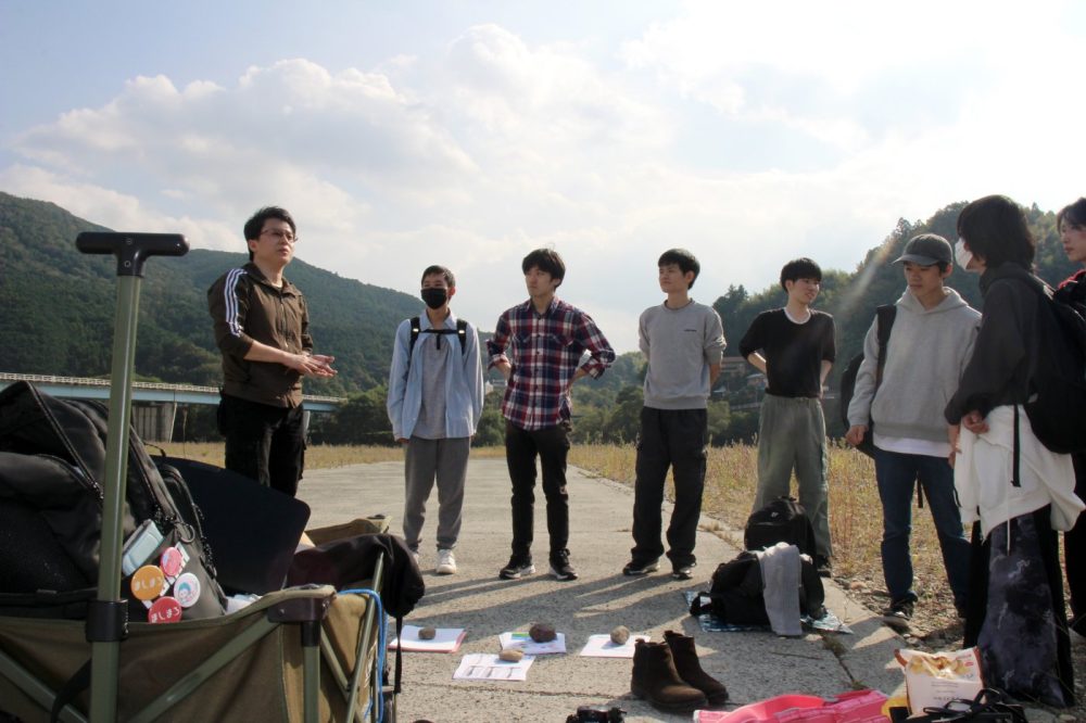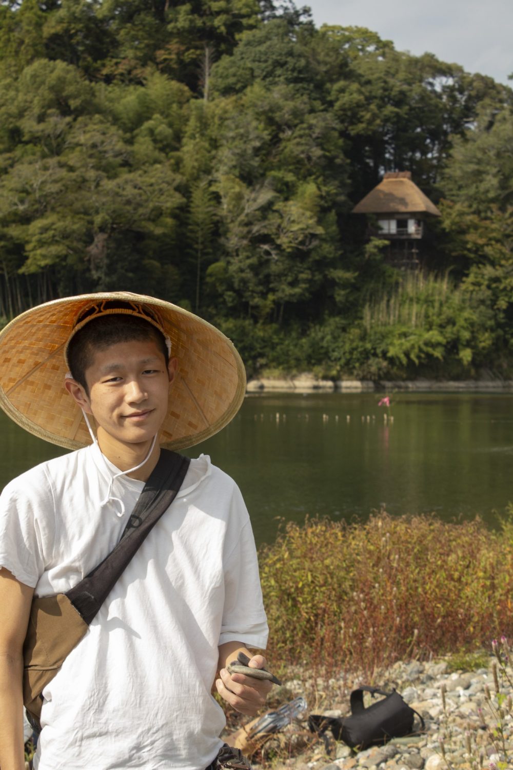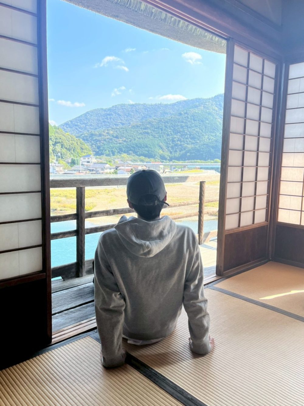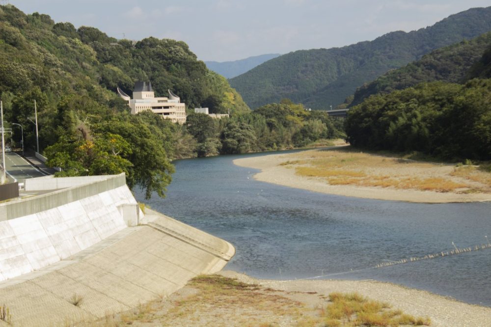 自由行動の後は、臥龍山荘の一角が見える肱川河で集合しデッサンの準備を行います。