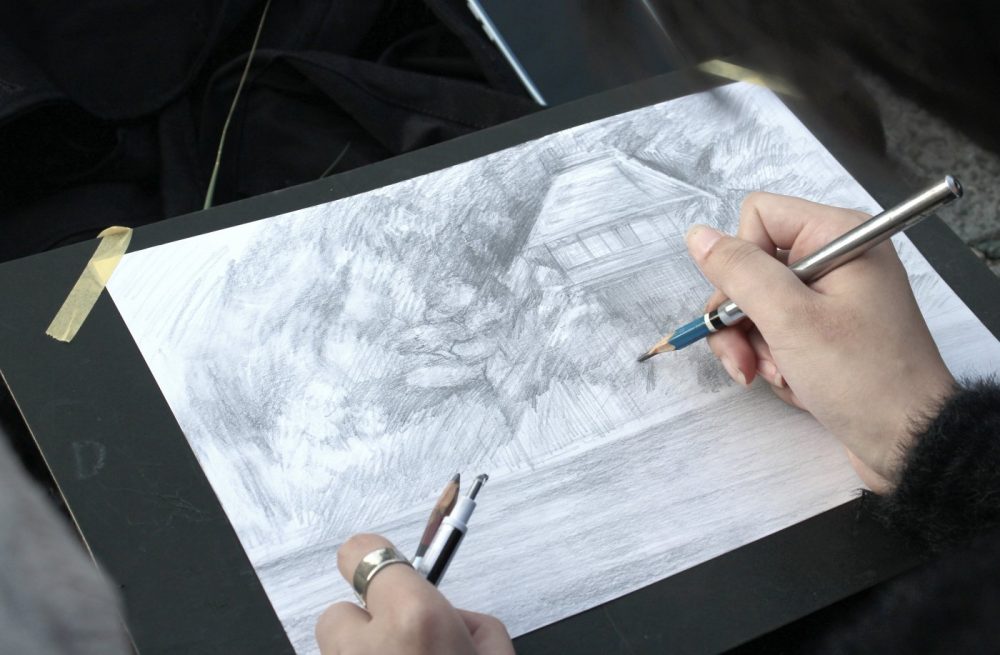 初めに先生から風景デッサンの説明があり、その後は各自でどんどん描き進めます。