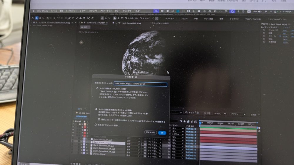 地球の表面に浮かぶ雲。それが地面に影を落とすことで、圧倒的な「巨大感」と「立体感」が生まれるんです。 雲のレイヤーを複製し、微妙にサイズを変え、色を調整して影を作る……。こういった細かい一手間の積み重ねが、映像の説得力を生むんですね。