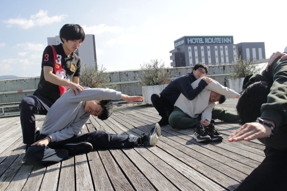 松山城が見える屋上で、体を伸ばしたり、軽い筋トレをしたり…
