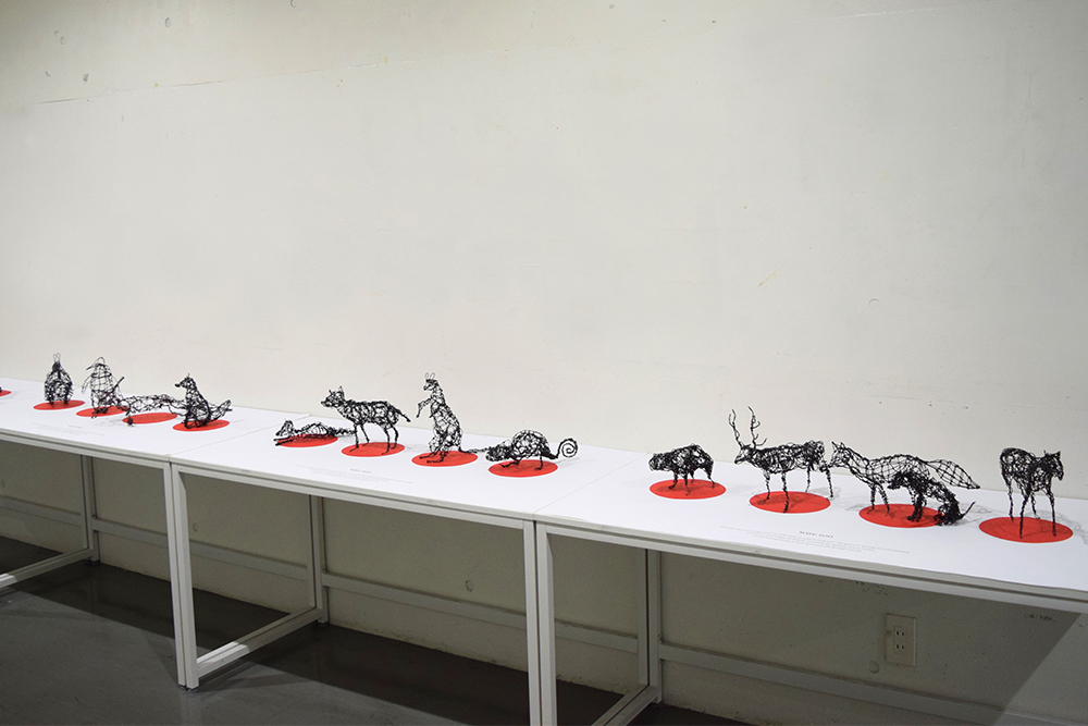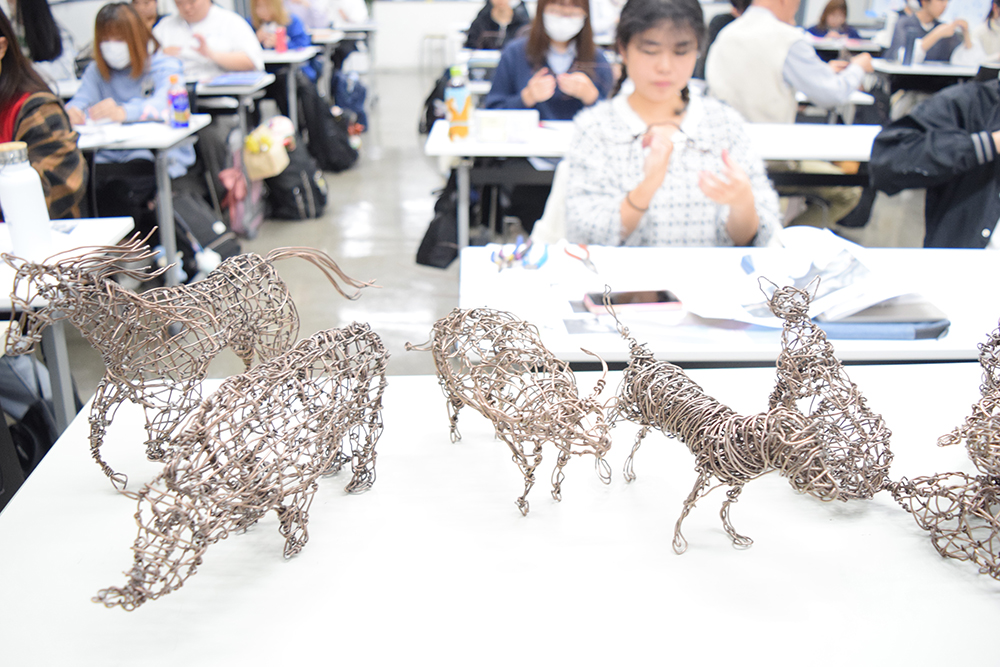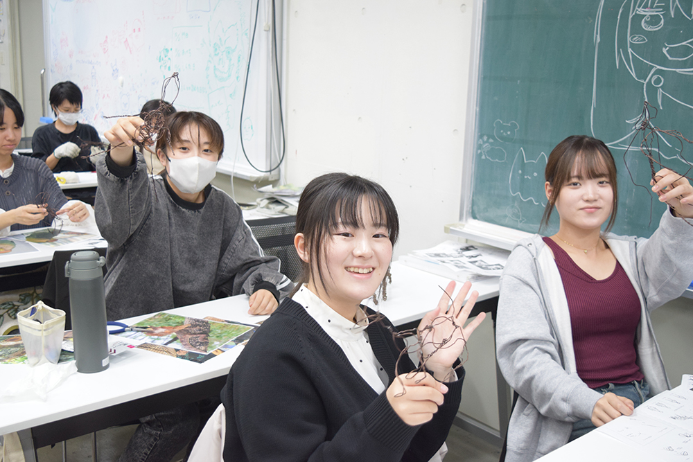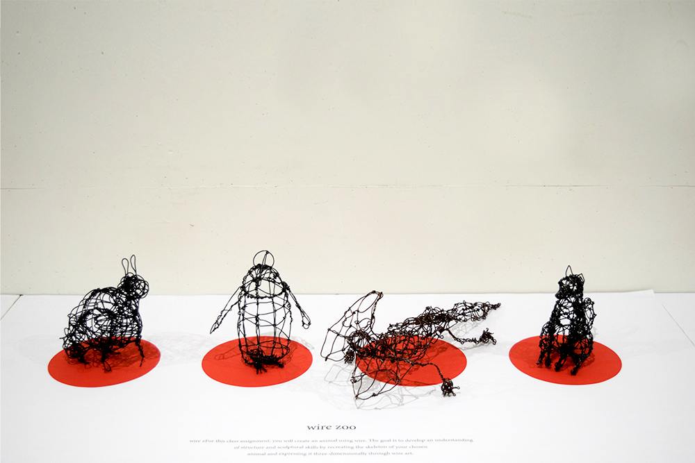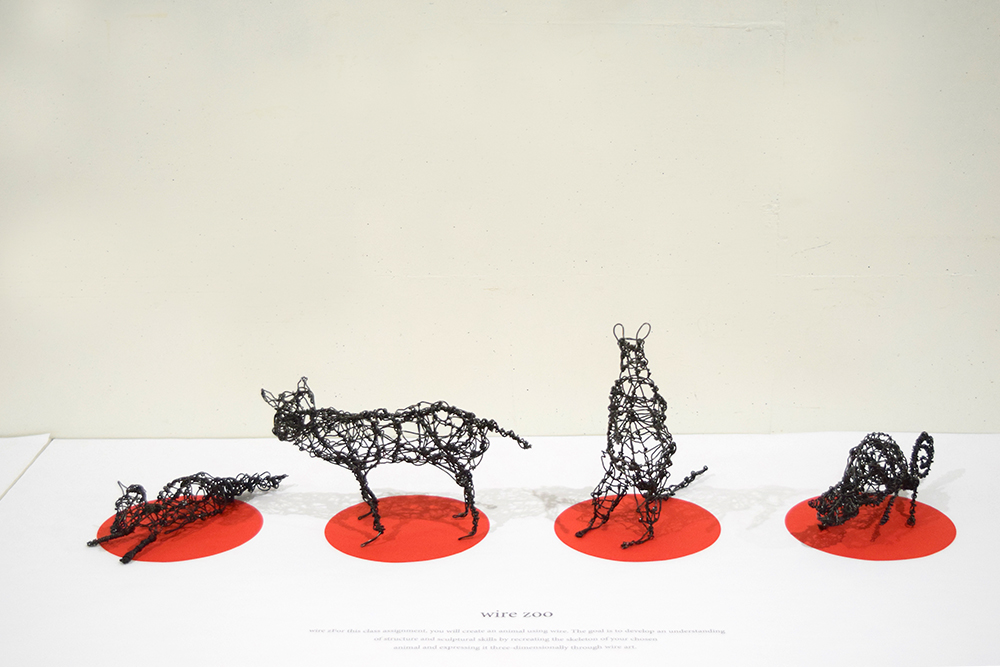 1年生が制作するアイアンアート作品。好きな動物の骨格を研究し、針金をぐるぐると巻きながら立体として形に起こしていきます。一見シンプルに見えますが意外と難しく、それでも一人ひとりの個性がしっかりと表れた動物たちに仕上がっています。こうして並べて飾ると、それぞれの違いが際立ち、とても面白い展示になりました。…ただし、実はこの作品たち、今年の1年生のものではありません。卒業生の作品です。飾る準備をしている間に、今の1年生の作品はすでに持ち帰られていたようで。卒業生の皆さん、これを見て「これ、私のやん!」と思っているかもしれませんね(笑)