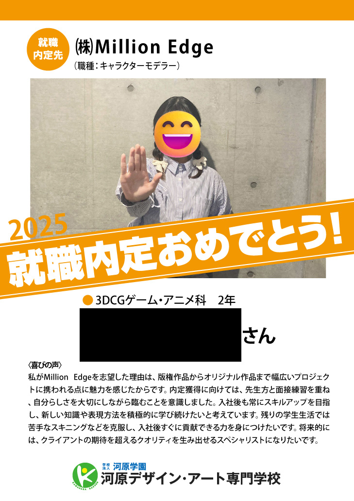 ![🎊業界内定者インタビュー 26卒vo.9 [済美高等学校 美術科出身 Sさん]🎊 🎊業界内定者インタビュー 26卒vo.9 [済美高等学校 美術科出身 Sさん]🎊](https://idea.kawahara.ac.jp/wp-content/uploads/2025/11/9d1360358209acabf9bff8a085f11f88-440x275.jpg)