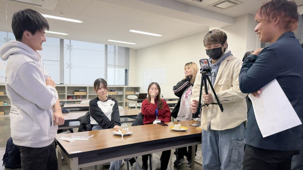 また、代表の学生が実際にカメラの前で食レポに挑戦!「生クリームのプルプル感」など、自分の言葉で魅力を伝える難しさと楽しさを肌で感じていました!