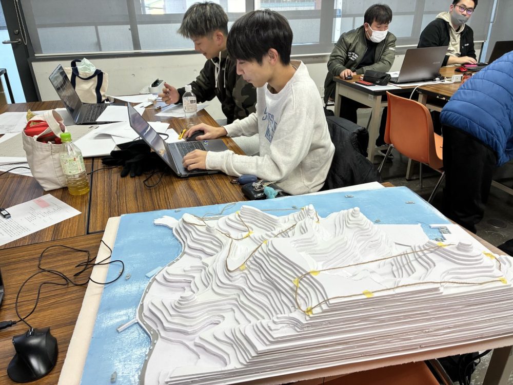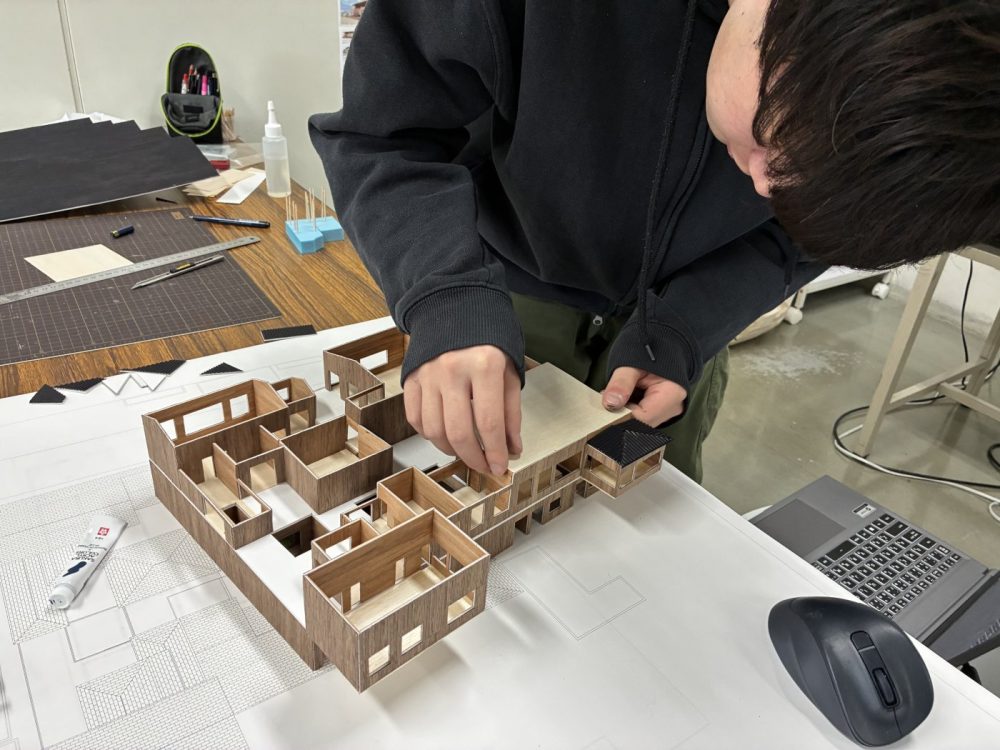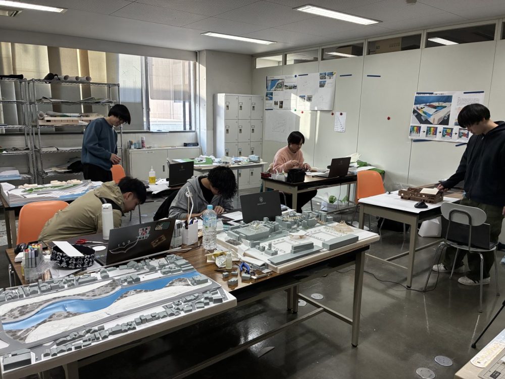 明けましておめでとうございます。インテリア・建築デザイン科の大谷でございます。建築全コースで年明け授業が始まっていますよ~、 まずは研究科2年生の部屋。最終の卒業作品審査が目前、教室は正に「背水の陣」といった雰囲気です。体に気をつけつつ是非完成させてくださ~い!