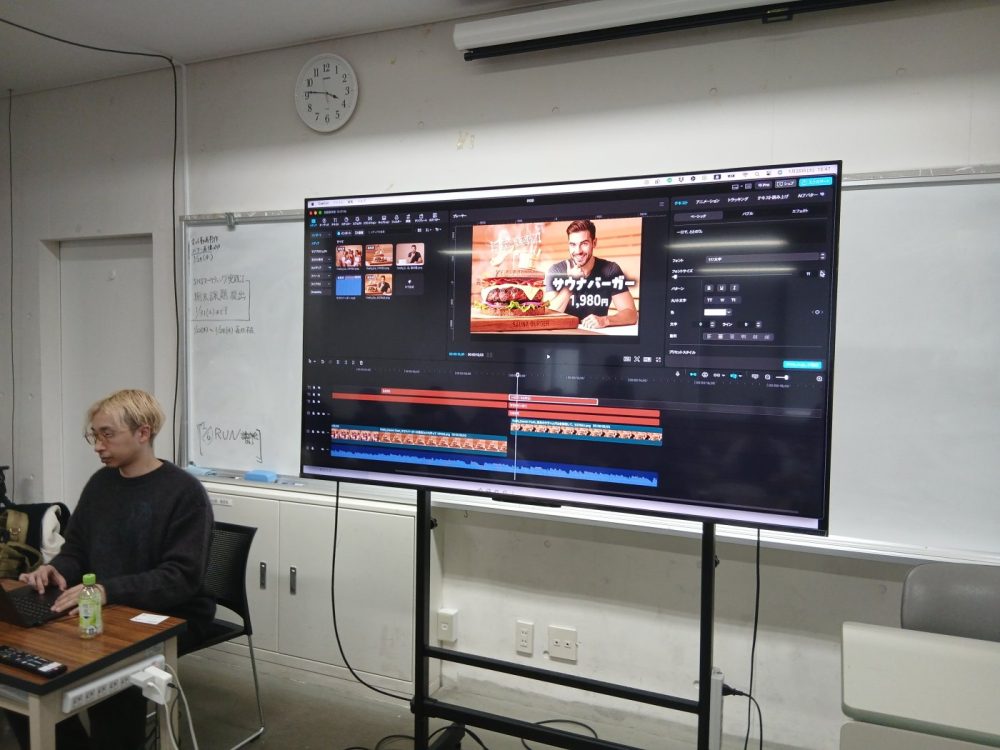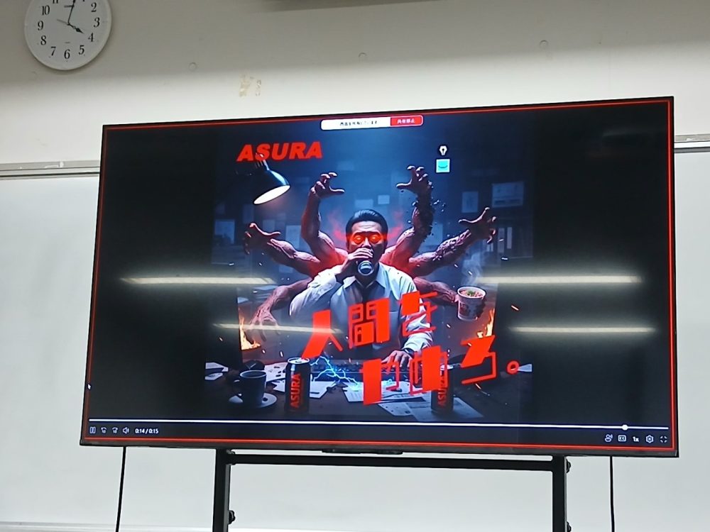 生成AIを駆使して架空の商品CMを作ってみよう、という想像力の試される授業…!まずは先生のお手本として、サウナで食べられるハンバーガー!?のCMを作っていただきましたΣ(゚Д゚)「バイブスコーディング」と言って、考えすぎず自分のバイブスに従ってどんどんアイデアをAIで生成していくのが良い作品を生み出すコツだそうです!