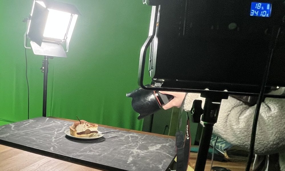 参加学生がライティング✨まで考えて撮ってくれました。🍫チョコレート層の中に「栗🌰」が見えるように少し明るめにセッティングしました。