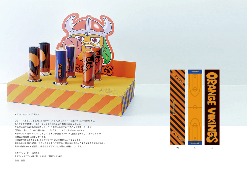 ・卒業制作として制作したオレンジバイキングスグッズの展示を行いました。当日は多くのファンの皆さまにお立ち寄りいただき、作品をきっかけにたくさんの交流が生まれました。直接感想をいただいたり、応援への想いを伺ったりと、学生にとっても大変貴重な経験となりました。ご来場いただいた皆さま、関係者の皆さま、ありがとうございました!!!