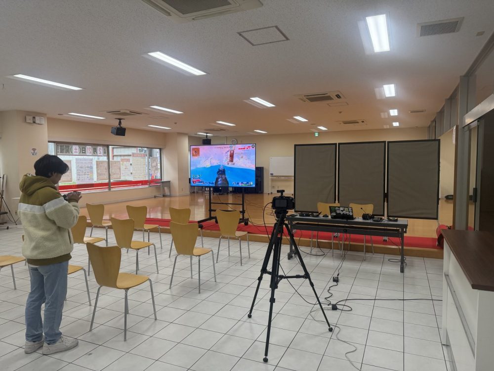 配信機材のセッティング、控室や会場前モニターへの映像出力チェックを行っていきます。