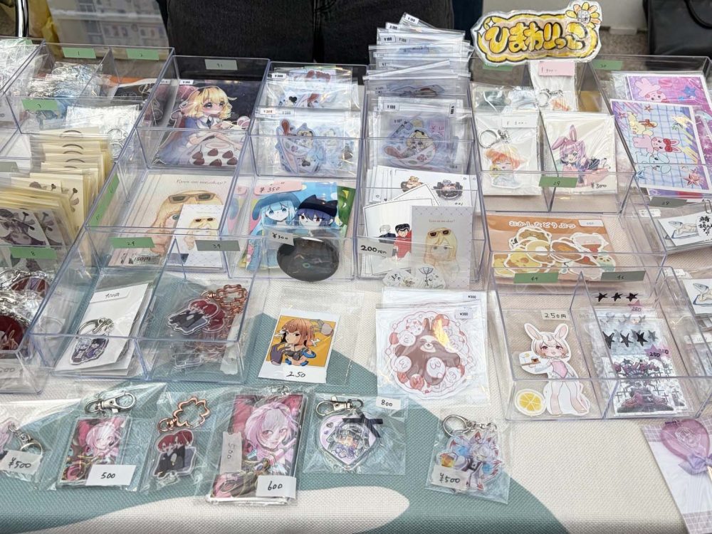 アクリルキーホルダー、ステッカー、ポストカードなど、ずらーっと商品が並んでいます🎶