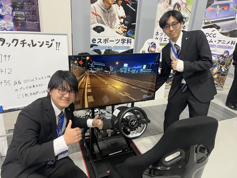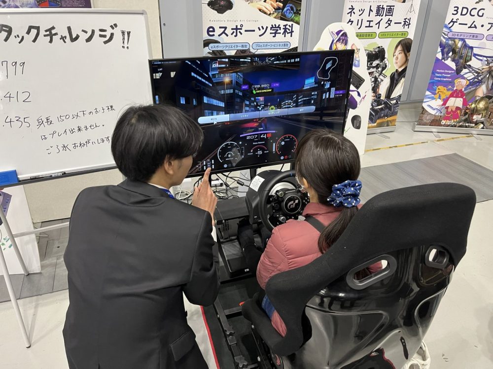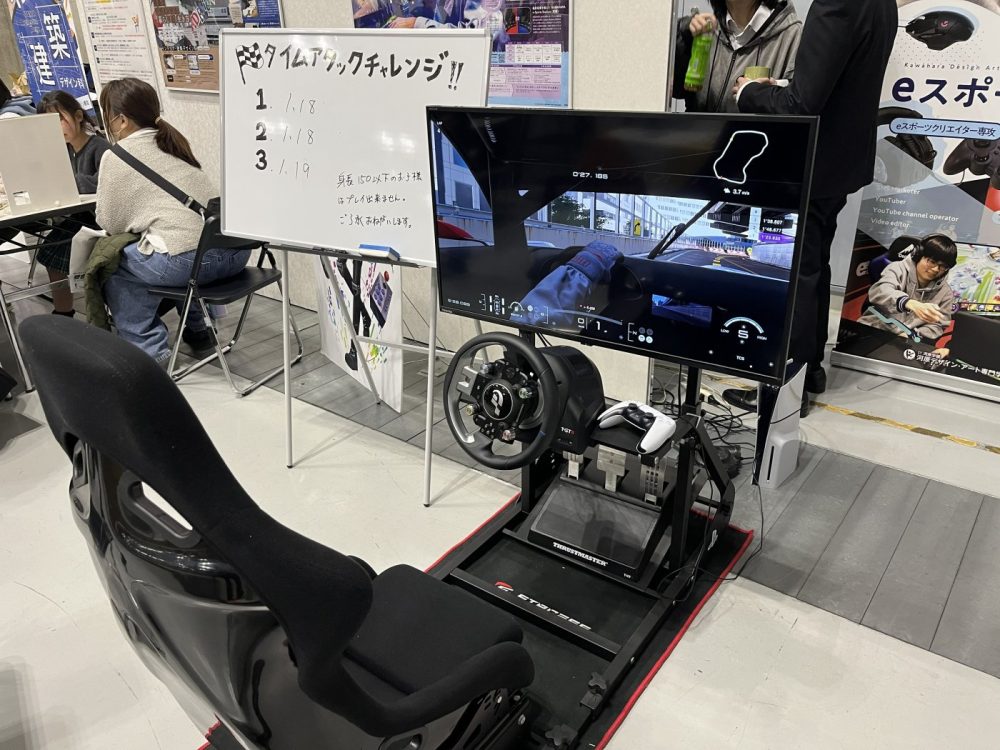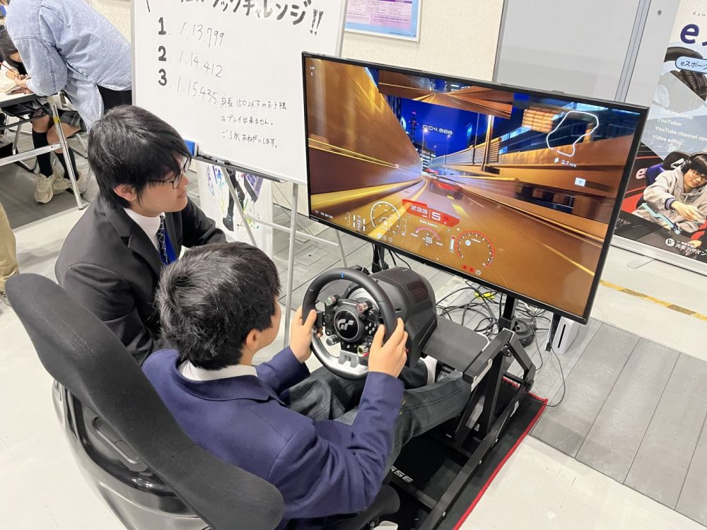 会場内のeスポーツブースでは、こちらのグランツーリスモタイムトライアル体験を行いました!🎮🎮本物さながらのハンドルやペダルでレース体験を行うことができます😆😆