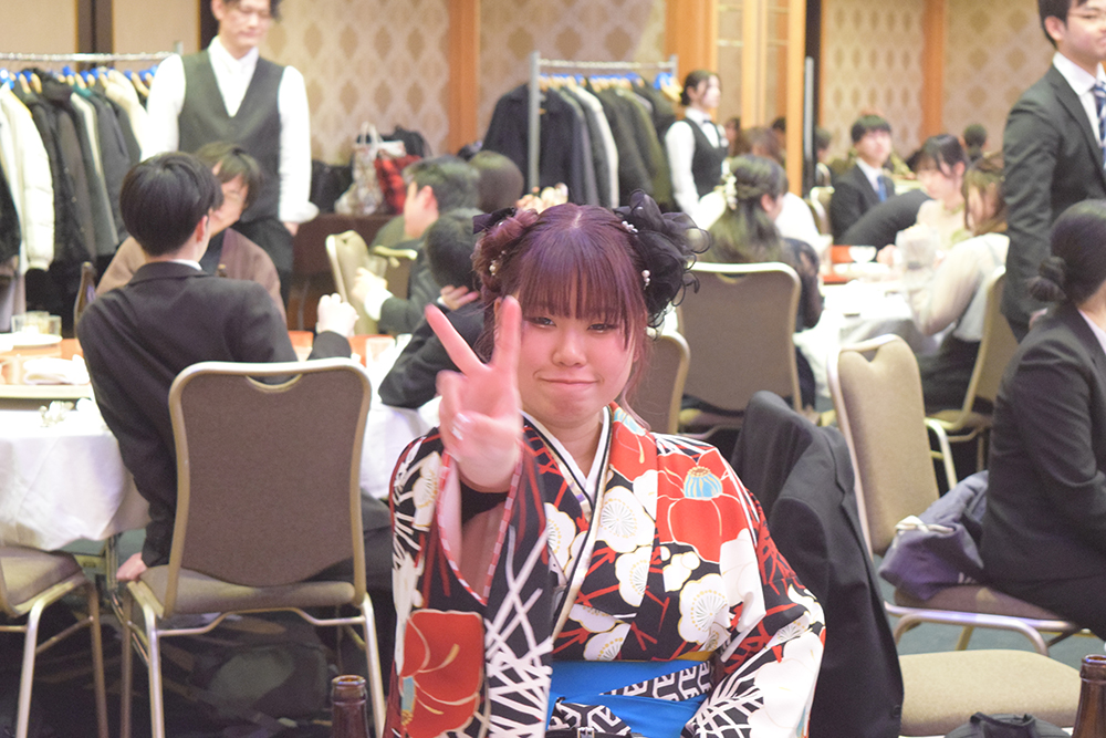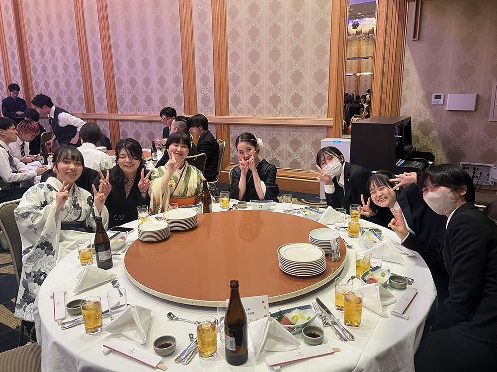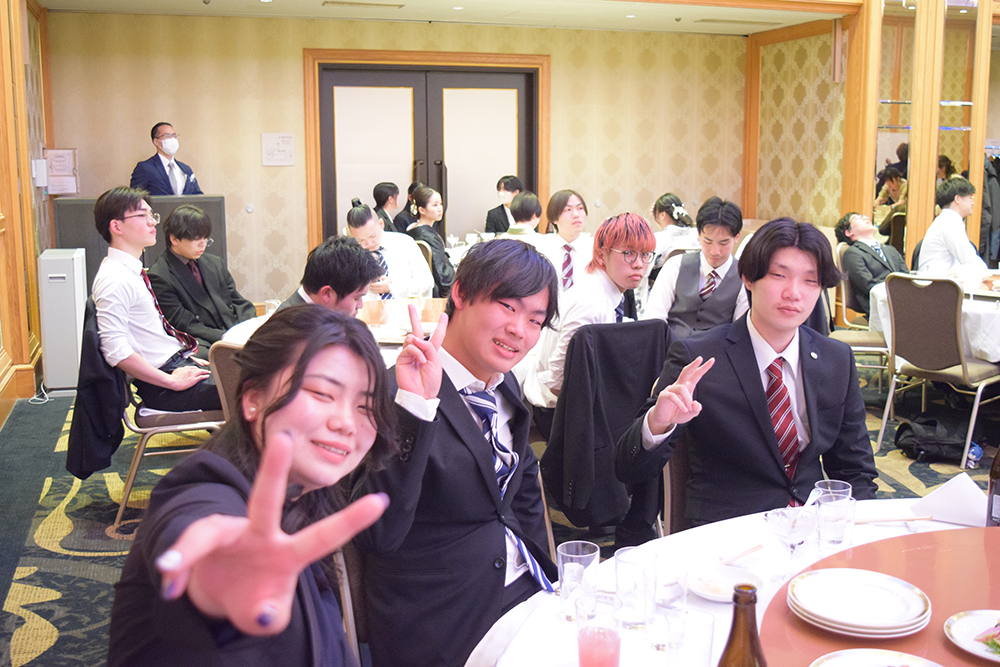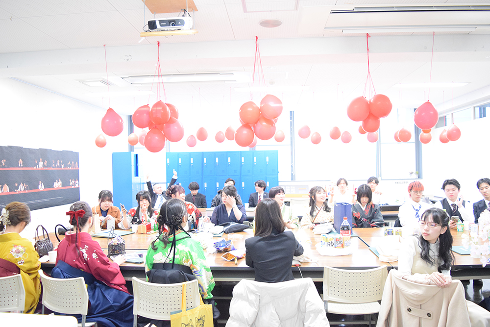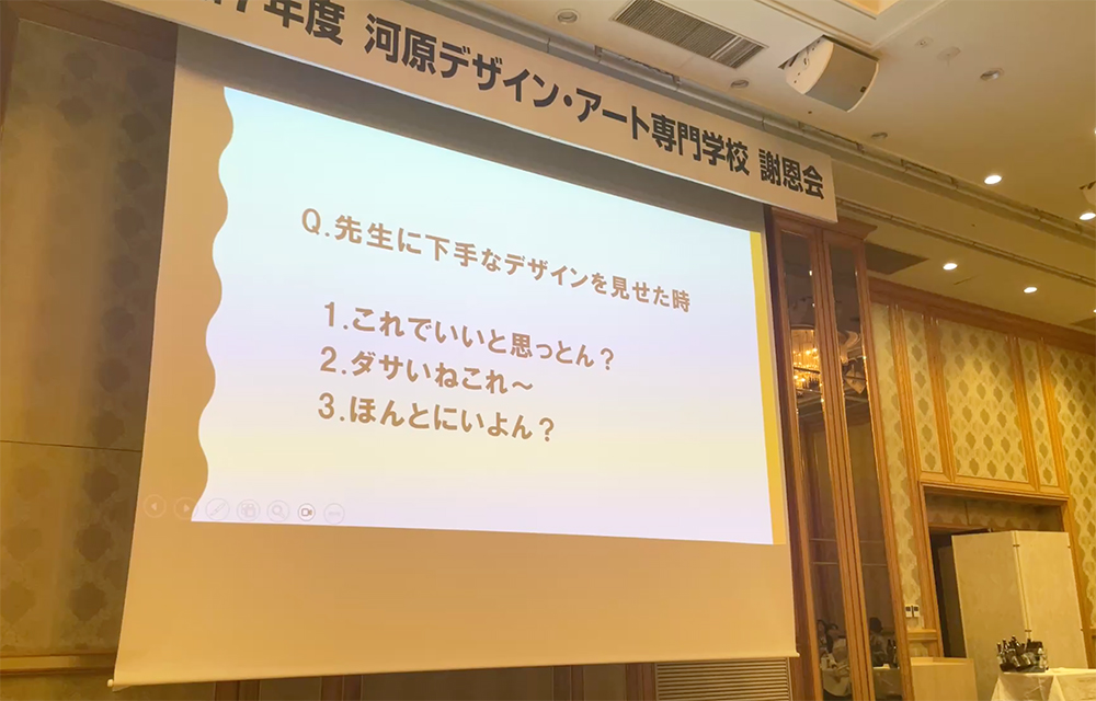 卒業式の後は場所を変えて謝恩会でした。皆んな楽しく飲んで食べて騒いで、楽しい時間となりました。私へのメッセージは、クイズ形式の演出で、下手なデザインを見せた時に何と言われるか?の質問。正解は「全部」。私の授業は、それは、それは厳しく容赦無くしてきましたので、皆んな鍛えれたんではないでしょうか。でも、安心してください。そこには厳しい中に愛情しかありませんから。